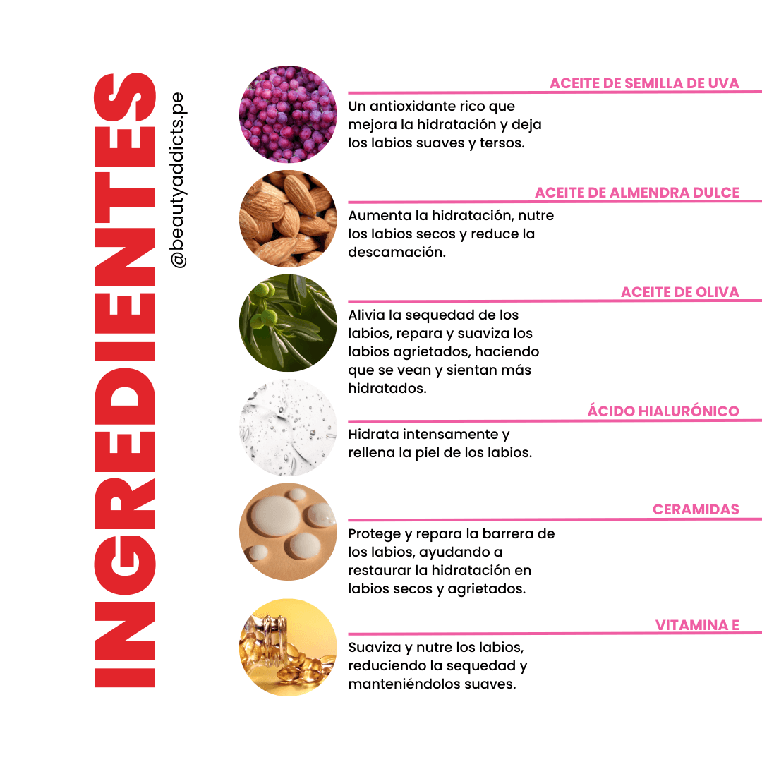 ¡Un labial hidratante y de larga duración, ideal para nuestro día a día! Formulado con ácido hialurónico, aceite de semilla de uva y almendras.