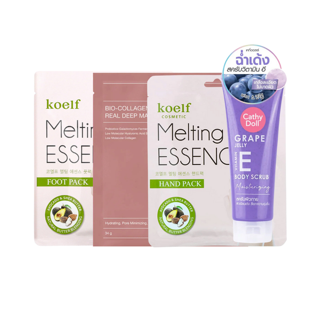 Contenido: Melting Essence Hand Mask de Koelf (1 unidad), Melting Essence Foot Mask de Koelf (1 unidad), Bio-Collagen Real Deep Mask de Biodance (1 unidad) y Body Scrub Grape Jelly de Cathy Doll (320g)